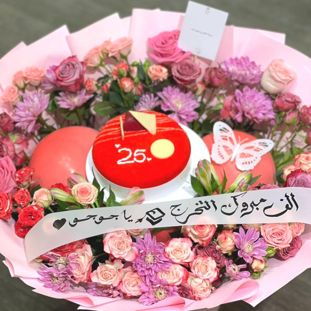 هذه الباقة مع كيكة اني وداني اللذيذة تأتي في تنسيق جميل وفني يعكس الابداع والحب.