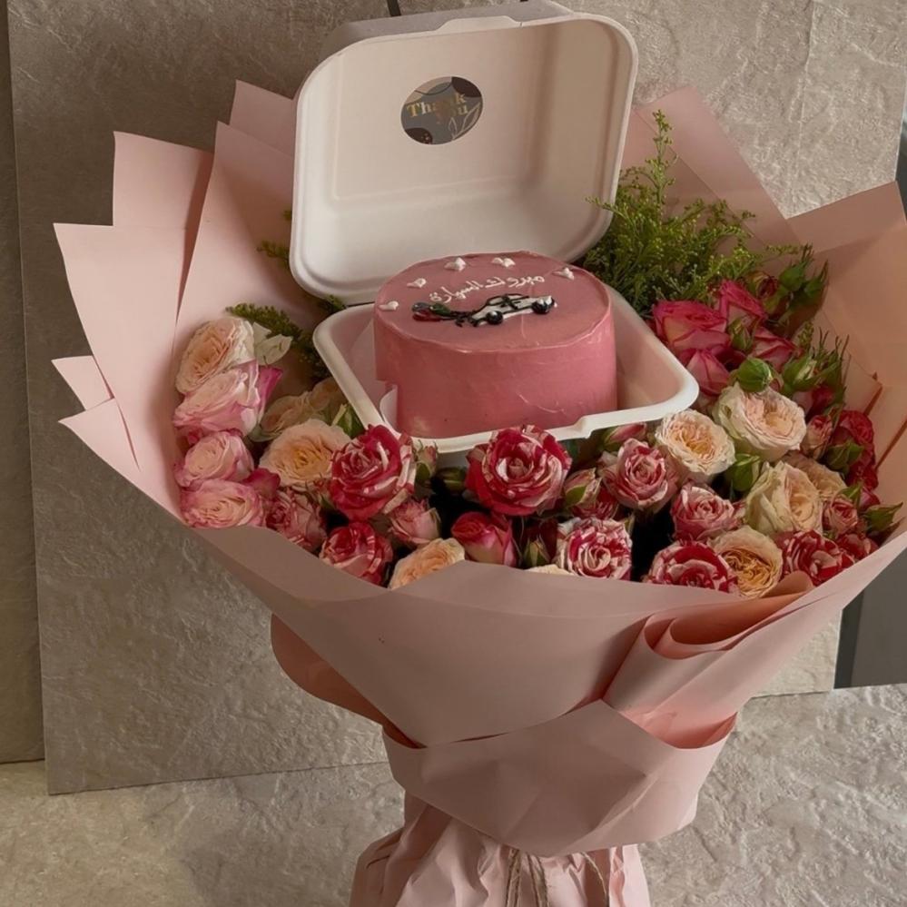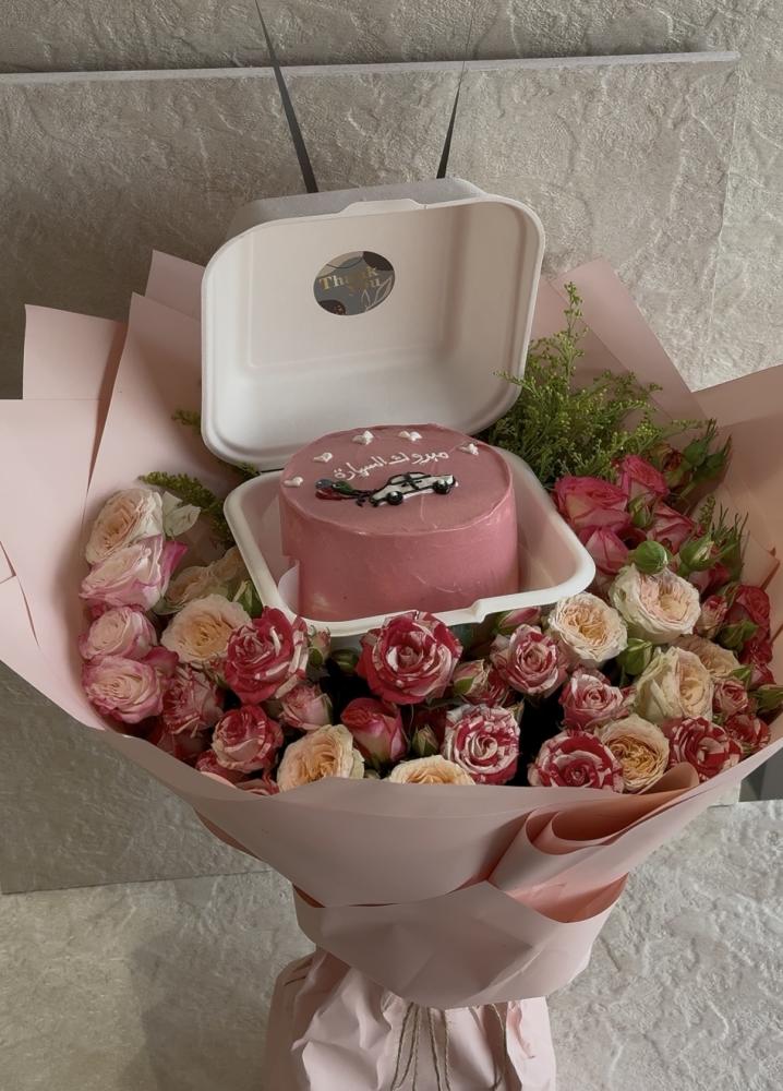 باقة ورد فاخرة تنطق بالفرحة، مزيّنة بزهور الروز المختارة بعناية، وفي قلبها كعكة صغيرة بطابع أنيق مكتوب عليها “مبروك السيارة”.